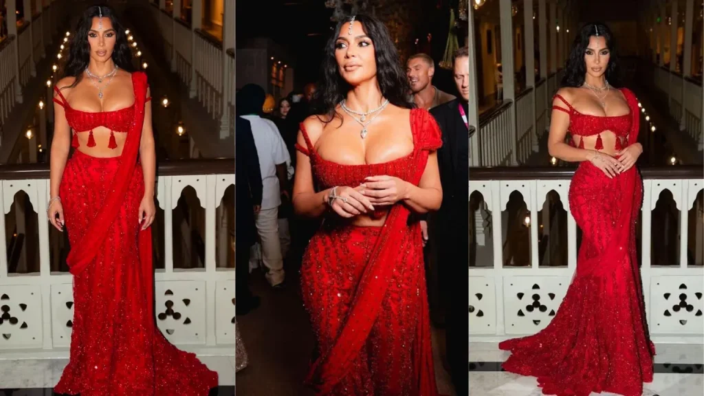 Khloé arrived in a crystal-embroidered lehenga by Manish Malhotra, complete with a maang tika, embracing a princess-like silhouette that felt celebratory rather than costumed. Kim, meanwhile, wore a striking red saree-lehenga, also by Manish Malhotra, reworking a traditionally bridal colour into a headline-grabbing global fashion statement.